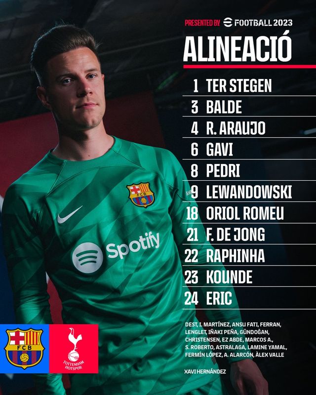 홈팀 바르셀로나는 4-1-4-1 전형으로 나섰다. 마르크 안드레 테어 슈테겐 골키퍼를 비롯해 로날드 아라우호, 쥘 쿤데, 에릭 가르시아, 알레한드로 발데가 수비를 구축했다. 신입생 오리올 로메우가 수비를 지켰고 2선엔 하피냐 연방준비제도이사회라, 프랭키 더 용, 가비, 최전방에 로베르트 레반도프스키가 출격했다. 사실상 바르셀로나의 베스트 라인업이다.