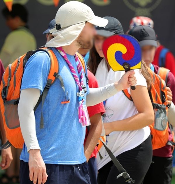 지난 4일 전북 부안군 세계스카우트잼버리 델타 구역에서 한 스카우트 대원이 태극부채로 더위를 식히고 있다. /이하 뉴스1