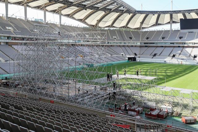 8일 오후 서울 마포구 상암월드컵경기장에서 작업자들이 2023 새만금 세계 스카우트 잼버리 폐영식 행사 중 하나인 'K-팝 슈퍼 라이브' 콘서트 무대를 설치하고 있다.