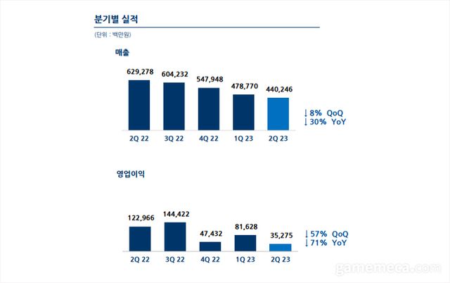 엔씨소프트는 9일 자사 2023년 2분기 실적을 발표했다. 2분기에 엔씨소프트는 매출 4,402억 원, 영업이익 353억 원, 당기순이익 305억 원을 기록했다. 매출은 전년 동기보다 30% 하락했고, 영업이익과 당기순이익은 각각 71%, 74% 줄었다. 실적악화 주 요인은 모바일게임 매출 감소다. 2분기 모바일게임 매출은 2,969억 원으로, 전년 동기보다 37.5% 감소했다.