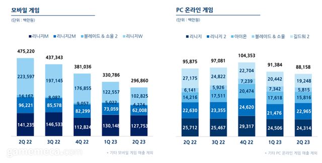 ▲ 엔씨소프트 2022년 2분기~2023년 2분기 모바일게임과 PC온라인게임 매출 추이 (자료출처: 엔씨소프트 IR페이지)