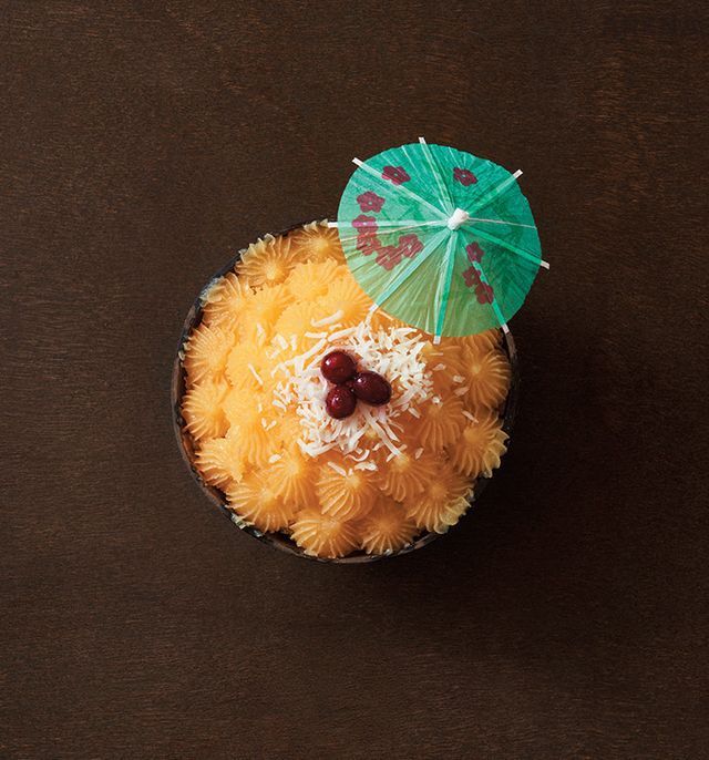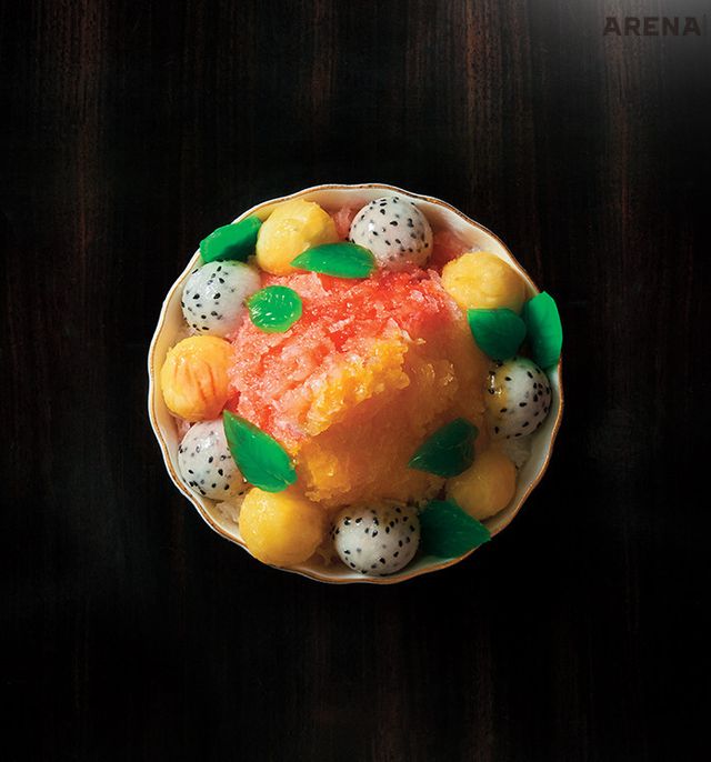 “싱가포르식 빙수 ‘아이스 카창’에서 영감을 받았습니다. 알록달록하고 화려한 색감이 특징인 데 반해, 맛은 가볍고 밍밍한 편이에요. 아무것도 첨가하지 않은 간 얼음 위에 판단 잎 젤리, 색소 시럽, 통조림 과일 등이 올라가거든요. 댄싱선라이즈 빙수는 강렬하고 확실한 맛을 내려 노력했어요.” 강해인 셰프의 말이다. 이곳의 빙수는 코코넛밀크를 얼려 만든다.다양한 과일 맛의 조화가 포인트다. 코코넛밀크 얼음 위에 얹은 용과와 파인애플에 망고 퓌레와 레드 오렌지 퓌레를 취향껏 뿌려 섞어 먹는다. 은은한 코코넛 향 위로 과일 퓌레의 단맛이 휘감긴다. 칵테일 ‘데킬라 선라이즈’의 빙수판 같은데, 이 역시 강 셰프의 의도다. 녹색, 노란색, 붉은색 등 빙수에 올리는 재료들의 색 조합도 볼수록 이국적이다.