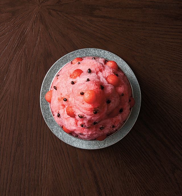 “인근 직장인이 ‘해장 빙수’라고 하며 많이 찾으세요.” 웨스틴 조선 서울 조재영 셰프의 첫마디였다. 수박 빙수의 포인트는 청량함. 메뉴를 개발할 때부터 깔끔한 뒷맛과 청량함을 강조하기 위해 노력했다. 수박 과즙을 얼음으로 만들어 곱게 갈고, 그 위에 동그랗게 파낸 수박을 얹고, 또다시 얼음으로 덮는 과정을 여러 차례 거듭해 만든다.“한 그릇만으로 더위와 갈증을 해소할 수 있도록 만들었습니다. 청량함이 관건인 만큼, 빙수 얼음에 우유를 섞는 대신 오직 수박 과즙만을 이용해 얼음을 만들었고요.” 여름을 떠올렸을 때 가장 먼저 생각나는 과일인 수박 한 통을 그대로 맛보는 듯한 상쾌함이 도드라진다. 해바라기 씨로 만든 초콜릿을 군데군데 얹어 실제 수박 모양을 구현한 발상도 귀엽다.