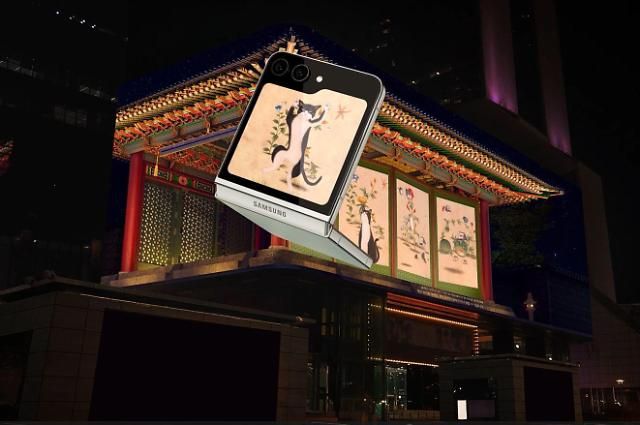 三星电子在首尔江南国际会展中心(COEX)户外大屏投放以朝鲜王朝著名书画家申师任堂的“草虫图”为题材的旗下Galaxy系列新折叠旗舰“Flip 5”和“Fold 5”三维立体(3D)广告。【图片提供 韩联社】