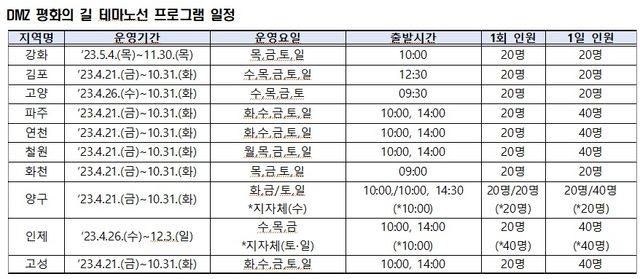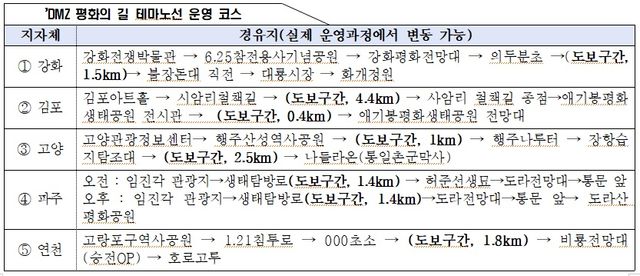테마노선은 강화, 김포, 고양, 파주, 연천, 철원, 화천, 양구, 인제, 고성 등 DMZ를 접하고 있는 10개 접경 지자체 각각의 고유한 역사와 문화에 대해 해설사의 안내를 들으면서 도보와 차량으로 이동하며 체험하는 프로그램이다.