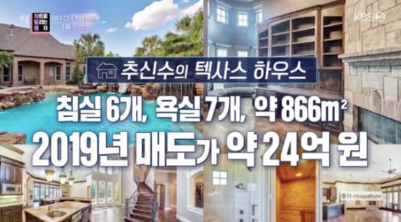 비시즌에는 가족들과 함께 해당 집에서 생활한 것으로 알려져 있지만, 2019년에 약 24억원에 매도했습니다. 또한 2021년 10월 22일에 방송된 KBS 2TV 생방송 ‘연중 라이브’에 따르면 추신수는 텍사스에만 해당 건물 외에도 총 2개의 하우스를 더 보유하고 있습니다.