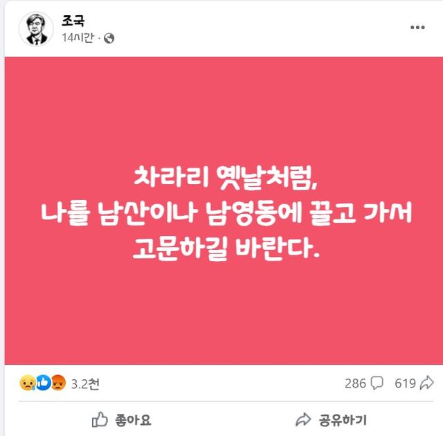조 전 장관은 지난 10일 오후 자신의 페이스북에 "차라리 옛날처럼, 나를 남산이나 남영동에 끌고 가서 고문하길 바란다"는 글을 남겼다. 이날 서울중앙지검 공판5부(김민아 부장검사)는 조씨를 허위작성공문서행사·업무방해·위계공무집행방해 혐의로 불구속기소 했다. 조 전 장관의 글은 이를 겨냥한 것으로 보인다. 검찰은 조씨의 일부 혐의 공소시효 만료를 약 보름 앞두고 기소했다.