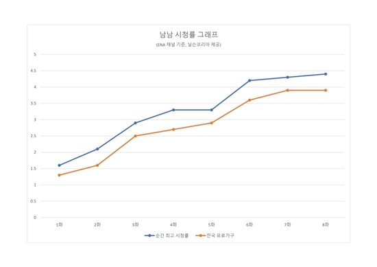 지난 7월 17일 첫 방송된 ‘남남’은 전국 유료 가구 기준 1.3%의 시청률로 시작해 지난 8회(8월 8일 방송) 3.9%를 달성하며, 무려 세 배 이상의 시청률 상승을 이뤄냈다.