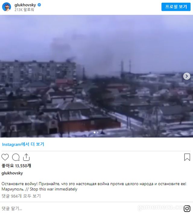 ▲ 러시아 군대의 우크라이나 침공 영상을 올리며 전쟁을 즉각 중단하라는 메시지를 전한 글루코프스키 (자료출처: 글루코프스키 공식 인스타그램)