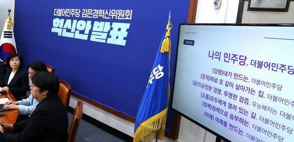 앞서 혁신위는 전날 당 지도부 선출에서 대의원의 표 가치를 권리당원과 같게 하자고 제안했다. 현행 제도에서 대의원 1표는 권리당원 60표와 맞먹는다. 구체적으로 대의원 투표 비중 30%를 없애고, 대신 당대표와 최고위원을 권리당원(대의원 포함) 투표 70%와 국민여론조사 30%씩을 반영해 뽑아야 한다고 했다. 현행 당헌·당규상 전당대회 투표 반영 비율은 대의원 투표 30%, 권리당원 투표 40%, 일반당원 투표 5%, 일반국민여론조사 25%다.