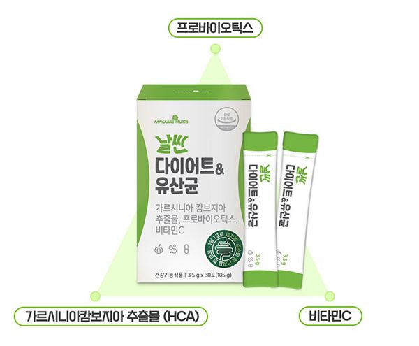 이 유산균에는 가르시니아 캄보지아 추출물이 무려 750g이나 함유되어 있다. 가르시니아 캄보지아 추출물은 탄수화물 섭취 시 체지방 축적을 억제해 준다.