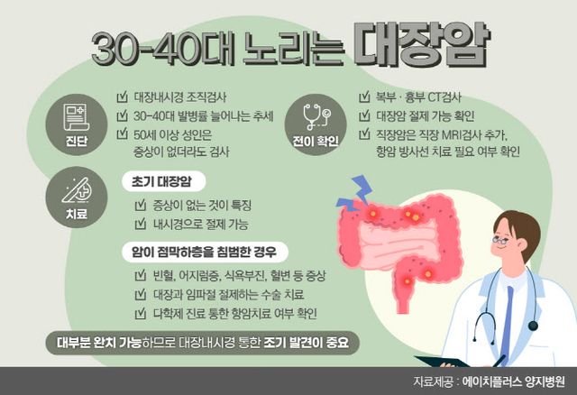 에이치플러스 양지병원 손정탁 외과 전문의는 “초기 대장암은 증상이 없는 것이 특징으로 증상이 없어도 눈에 띄지 않는 장출혈로 인해 빈혈과 어지럼증이 생기며 식욕부진과 체중감소가 동반될 수 있다”며 “암이 더 진행된 경우 복통과 변이 가늘어 지거나 혈변이 발생한다” 고 설명했다. 손 전문의는 “항문 출혈이 있을 경우, 단순 항문질환인지, 대장 종양의 원인인지 꼭 진료 받고 확인 해야 한다”고 덧붙였다.