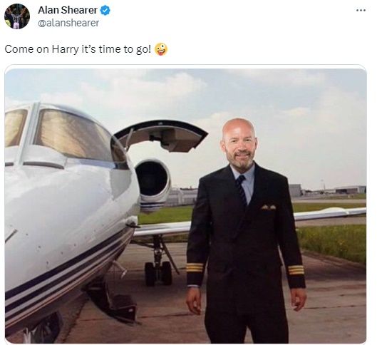 시어러는 11일(한국시간) SNS을 통해 "해리, 이제 갈 시간이다!"라며 한 장의 사진을 게시했다. 시어러가 올린 사진은 합성 사진으로, 비행기 옆에 서 있는 시어러가 마치 비행기 조종사로 보이는 사진이었다.