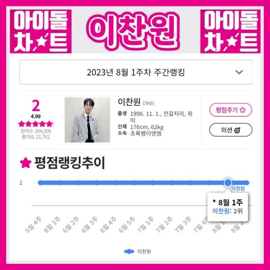 (엑스포츠뉴스 이정범 기자) 이찬원이 8월 1주 차 아이돌차트 평점 랭킹 2위에 올랐다.