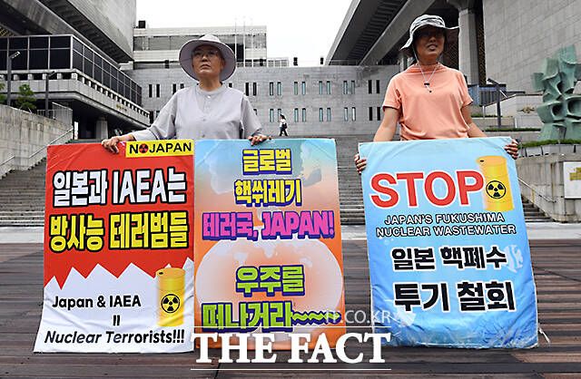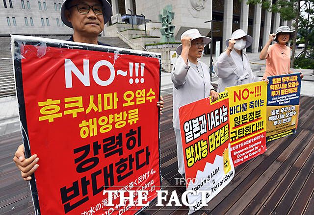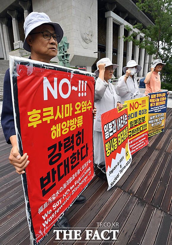 [더팩트ㅣ임영무 기자] 범시국법회, 불교환경연대, 안산환경연합 등 환경단체들이 12일 오전 서울 종로 세종문화회관 앞에서 후쿠시마 오염수 방류 규탄 집회를 갖고 있다.