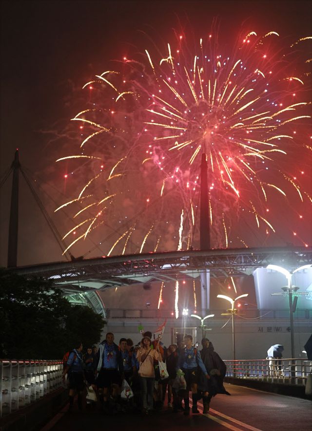 11일 서울 마포구 상암동 서울월드컵경기장에서 2023 새만금 세계스카우트 잼버리 폐영식과 K팝 슈퍼 라이브 콘서트 관람을 마친 세계스카우트 대원들이 불꽃놀이를 뒤로한 채 경기장을 나와 버스로 향하고 있다.(사진=연합뉴스)