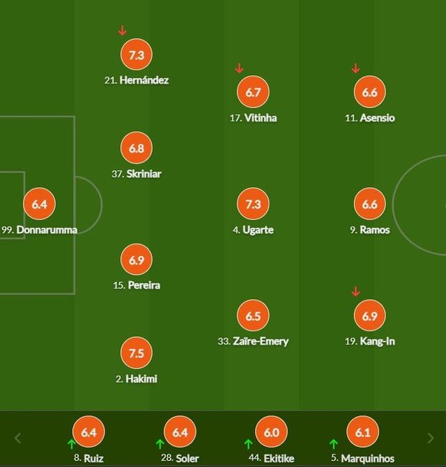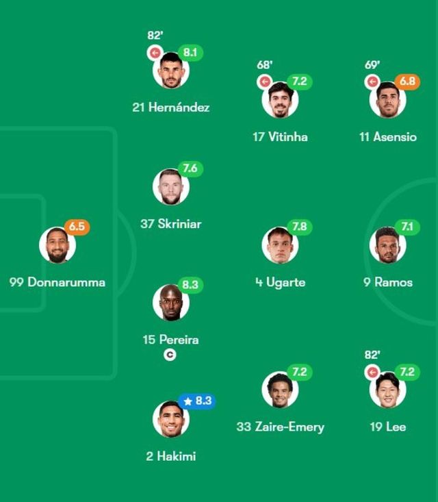 후스코어드닷컴 : 잔루이지 돈나룸마(6.4점) – 뤼카 에르난데스(7.3점), 밀란 슈크리니아르(6.8점), 다닐루 페레이라(6.9점), 아치라프 하키미(7.5점) – 비티냐(6.7점), 마누엘 우가르테(7.3점), 워렌 자이르에머리(6.5점) – *이강인(6.9점), 곤살루 하무스(6.6점), 마르코 아센시오(6.6점)