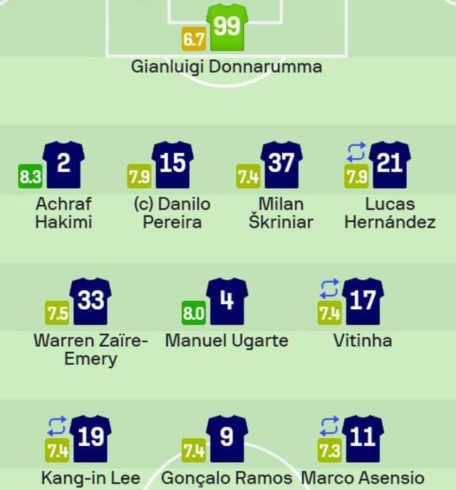 소파 스코어 : 잔루이지 돈나룸마(6.7점) – 뤼카 에르난데스(7.9점), 밀란 슈크리니아르(7.4점), 다닐루 페레이라(7.9점), 아치라프 하키미(8.3점) – 비티냐(7.4점), 마누엘 우가르테(8.0점), 워렌 자이르에머리(7.5점) – *이강인(7.4점), 곤살루 하무스(7.4점), 마르코 아센시오(7.3점)