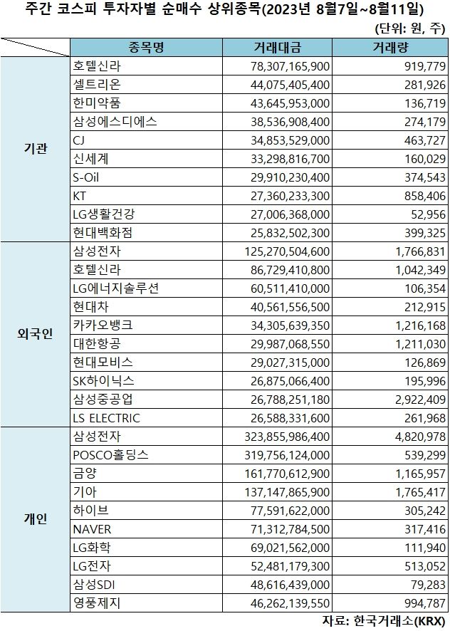 기관 '호텔신라'·외인 '삼성전자'·개인 '삼성전자' 1위 [주간 코스피 순매수- 8월7일~8월11일]