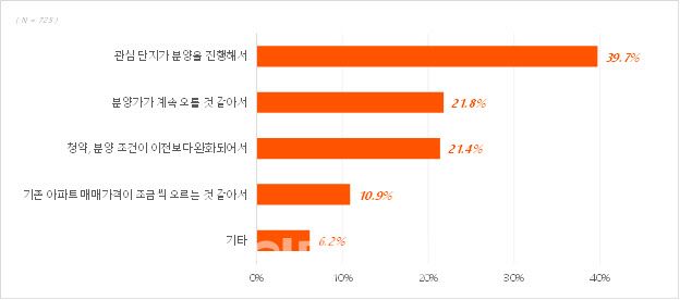 ㈜직방이 어플리케이션 이용자 중 2023년 올해 이미 청약을 진행했거나 하반기에 청약 계획이 있다고 답한 응답자 725명에게 청약 이유를 물은 결과, ‘관심 단지가 분양을 진행해서’가 39.7%로 가장 많았다. 그 다음으로는 △분양가가 계속 오를 것 같아서(21.8%) △청약, 분양 조건이 이전보다 완화되어서(21.4%) △기존 아파트 매매가격이 조금씩 오르는 것 같아서(10.9%) 순으로 나타났다.