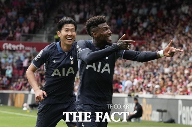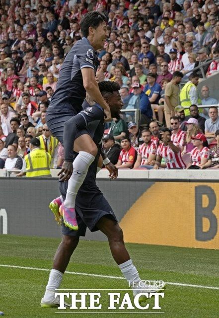 토트넘의 새 주장 손흥민(왼쪽)이 13일 브렌트포드와 2023~24시즌 개막전에서 전반 에메르송 로얄이 동점골을 터뜨린 뒤 함께 기뻐하고 있다./런던=AP.뉴시스