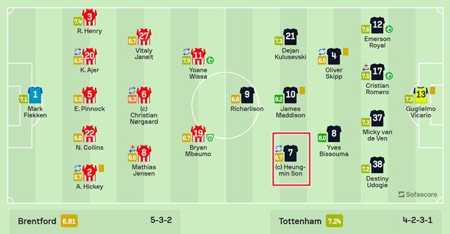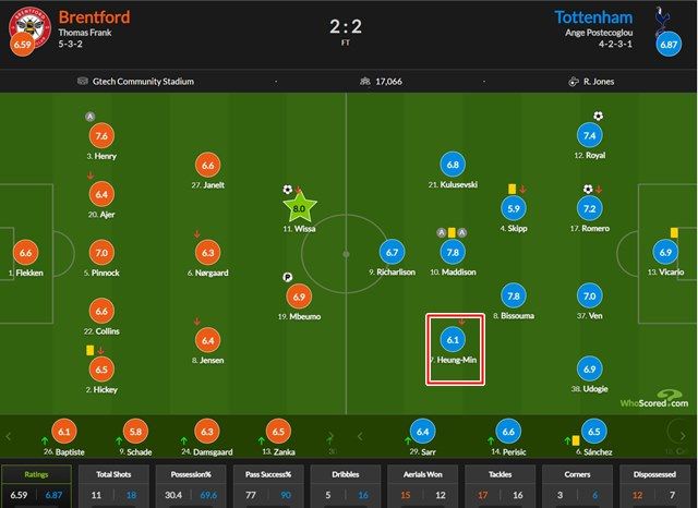 후스코어드닷컴의 토트넘-브렌트포드 개막전 선수 평점./후스코어드닷컴