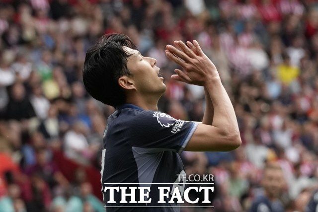 토트넘의 주포 해리 케인 이적 후 주장 데뷔전을 치른 손흥민이 결정적 득점 기회를 놓친 후 아쉬워하고 있다./런던=AP.뉴시스
