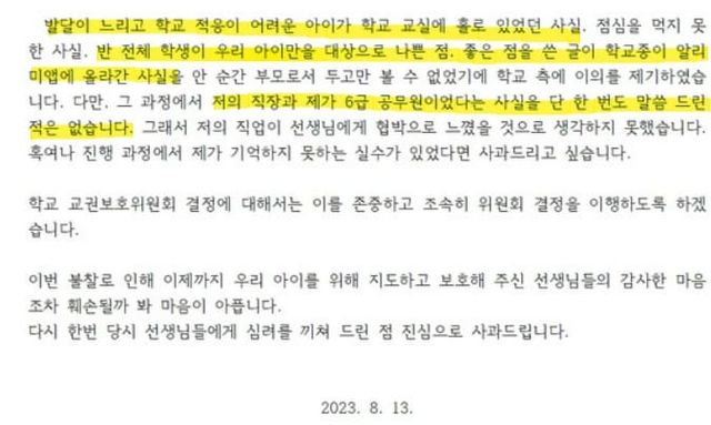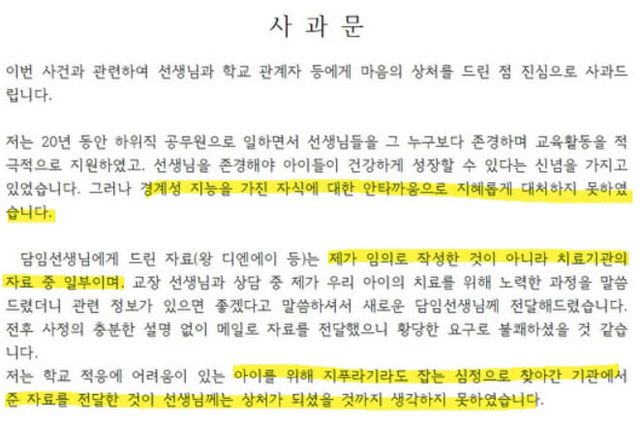 A씨는 8월 13일 사과문을 통해 “경계성 지능을 가진 자식에 대한 안타까움으로 지혜롭게 대처하지 못했다”며 “선생님과 학교 관계자 등에게 마음의 상처를 드린 점 진심으로 사과드린다”고 밝혔습니다.