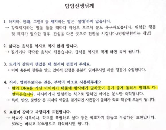 특히 A씨는 자신의 자녀에 대해 ‘왕의 DNA를 가진 아이이기 때문에 왕자에게 말하듯이 듣기 좋게 돌려서 말해도 다 알아듣는다’라며 ‘지시하거나 명령하는 식으로 말하는 아이는 분노만 축적된다’고 주문했습니다.