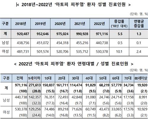 14일 국민건강보험공단이 발표한 '2018∼2022년 아토피 피부염 환자의 건강보험 진료현황'에 따르면 국내 건강보험 가입자 중 아토피 피부염으로 진료를 받은 환자는 2018년 92만487명에서 지난해 97만1천116명으로 5.5%(5만629명) 증가했다.