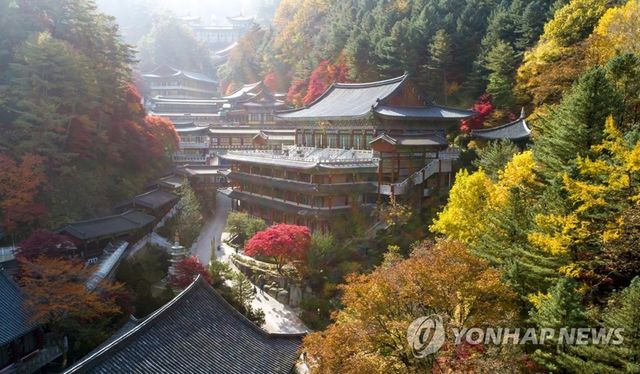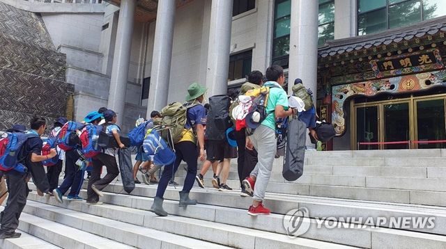 8일 오후 일본 스카우트 대원들이 충북 단양군 구인사에 도착, 숙소인 광명전 계단을 오르고 있다. / 연합뉴스