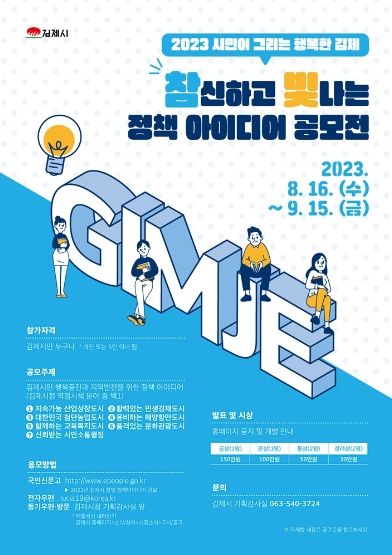 [파이낸셜경제=김영란 기자] 김제시는 8월 16일부터 9월 15일까지 시민들의 시정 참여 기회를 확대하고 창의적인 아이디어를 발굴하고자‘2023년 참(신하고) 빛(나는) 정책 아이디어 공모’를 진행한다.