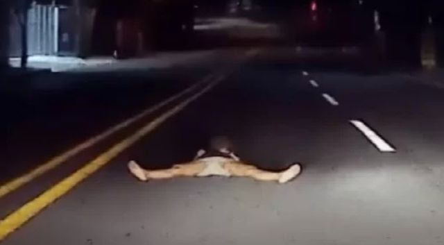 영상에는 어두운 밤 한 여성이 맨발로 다리를 쫙 벌린 채 도로에 누워있는 모습이 담겼다. 깜짝 놀라 경적을 울리고 피하는 제보자 A씨에게 여성은 “이리 와보라”고 도리어 성질을 냈다