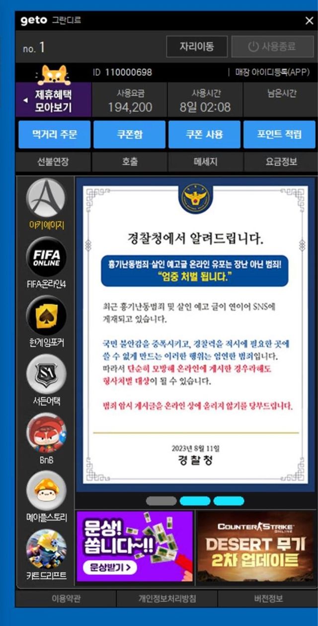제주경찰청은 PC방 관리프로그램을 운용하는 '엔미디어 플랫폼'과 협력해 전국 1만 여 곳 PC방 컴퓨터 화면에 흉악범죄 예고 글 게시행위를 엄중 처벌하는 내용의 배너와 카드뉴스를 상시 노출할 수 있도록 조치했다고 14일 밝혔다.