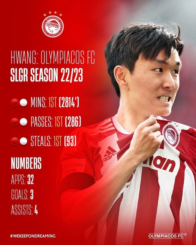 미드필더 황인범은 2022-23시즌을 앞두고 올림피아코스에 입단했다. 그리고 뛰어난 기량을 바탕으로 그리스 무대를 집어삼켰다. 황인범은 3선에서 패스, 탈압박, 경기 템포 조절 등을 선보이며 마에스트로와 같은 역할을 맡았다. 더불어 순간적인 2선 침투를 통해 공격에 숫자를 늘려주거나 직접 돌파를 통해 기회를 생산했다. 전체 기록은 공식전 40경기 5골 4도움이었고, 수페르리가 엘라다 사무국이 주관한 팬 투표에서 올림피아코스 ‘올해의 선수’로 선정됐다.