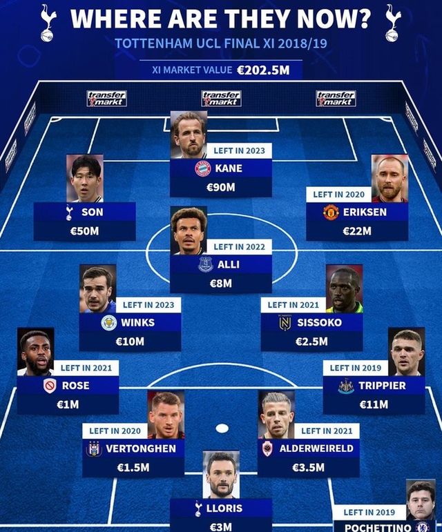축구통계매체 ‘트랜스퍼마크트’는 14일(한국시간) 토트넘 훗스퍼가 2018-19시즌 유럽축구연맹(UEFA) 챔피언스리그(UCL) 결승전에 진출했을 때 선발 출전했던 선수들을 조명했다. 당시 토트넘은 창단 첫 UCL 우승을 노렸는데 리버풀에 패하면서 준우승에 머물렀다. 준우승에 그쳤지만 마우리시오 포체티노 감독 아래에서 가장 정점에 올랐을 때로 평가된다.