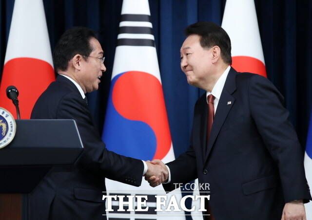 윤석열 대통령은 15일 제78주년 광복절 경축식 경축사에서 "일본은 이제 우리와 보편적 가치를 공유하고 공동의 이익을 추구하는 파트너"라고 말했다. 지난 5월 윤석열 대통령과 기시다 후미오 일본 총리 대통령실 청사에서 공동기자회견을 마친 뒤 악수하는 모습. /뉴시스