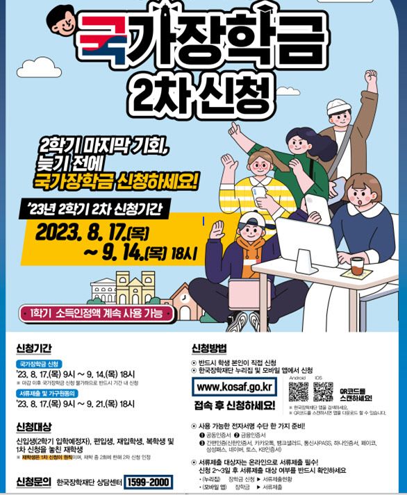 국가장학금은 한국장학재단 홈페이지와 모바일 앱에서 24시간 신청할 수 있다. 다만 마감일인 9월 14일에는 18시까지만 신청할 수 있으니 이 점 유의해야 한다.