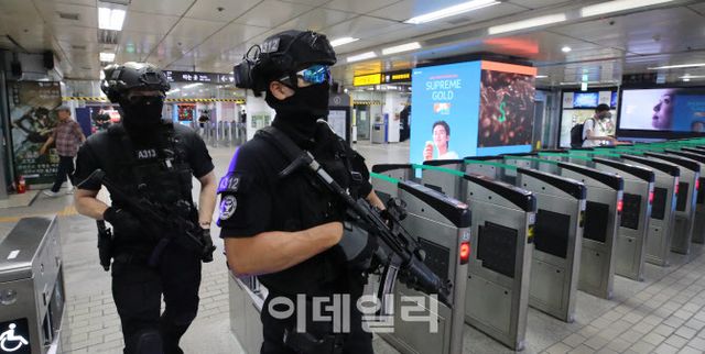 잇따른 ‘묻지마 흉기 난동’ 사건으로 시민 불안감이 커지고 있는 가운데 7일 오전 서울 강남역 일대에서 경찰특공대원들이 순찰을 하고 있다. (사진= 이영훈 기자)