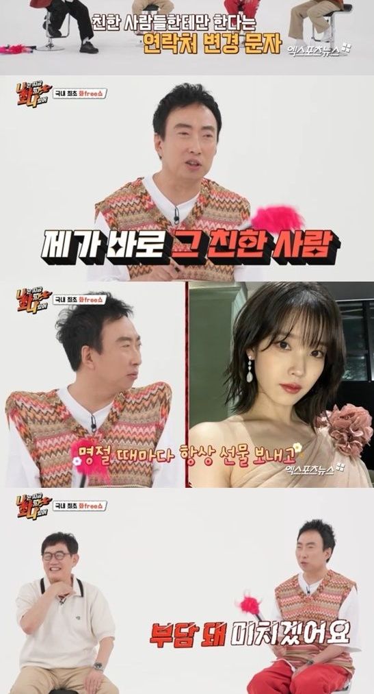 이어 아이유도 얼마 전에 전화번호 바뀌었다고 연락 왔더라. 보통 친한 사람들에게만 전화번호가 바뀌면 연락이 오지 않냐. 내게 왔다. 아이유는 명절 때마다 항상 선물 보낸다"라고 했다.