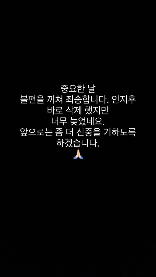 16일 고소영은 "중요한 날 불편을 끼쳐 죄송하다. 인지 후 바로 삭제했지만 너무 늦었다. 앞으로는 좀 더 신중을 기하도록 하겠다"라는 글을 올리며 사과했다.