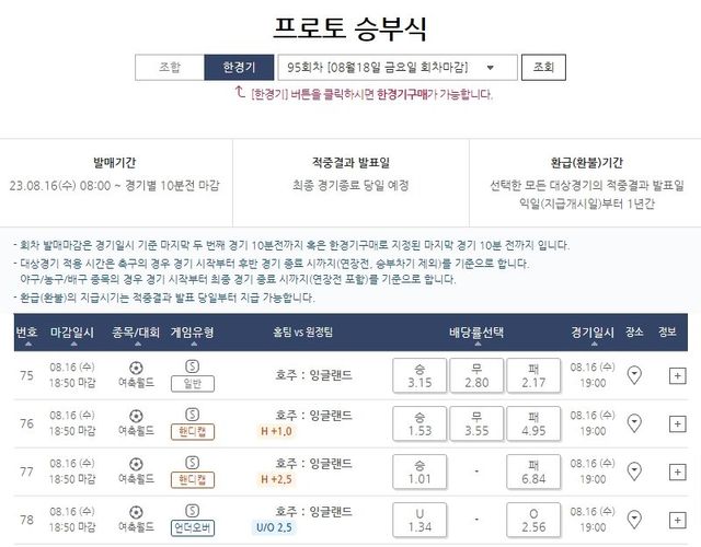 프로토 승부식 95회차 중 호주-잉글랜드전은 단 한 경기만을 선택해도 구매가 가능한 ‘한경기구매’ 게임으로 즐길 수 있다. 경기 시작 10분 전인 16일(수) 오후 6시50분까지 구매가 가능하며, ▲75번(일반) ▲76번(핸디캡) ▲77번(소수핸디캡) ▲78번(언더오버)의 각기 다른 4가지 방식으로 게임을 즐길 수 있다.