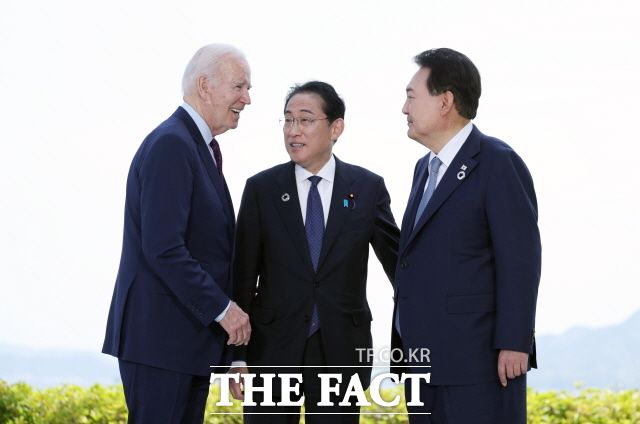윤석열 대통령은 15일(현지시간) 미 매체 블룸버그 통신과의 서면 인터뷰에서 북한 핵 확장억제와 관련해 한미일 간 별도 협의가 열려 있다고 말했다. 윤 대통령이 지난 5월 21일 히로시마 G7 정상회의장인 그랜드프린스호텔에서 조 바이든 미국 대통령, 기시다 후미오 일본 총리와 한미일 정상회담을 하는 모습. /뉴시스
