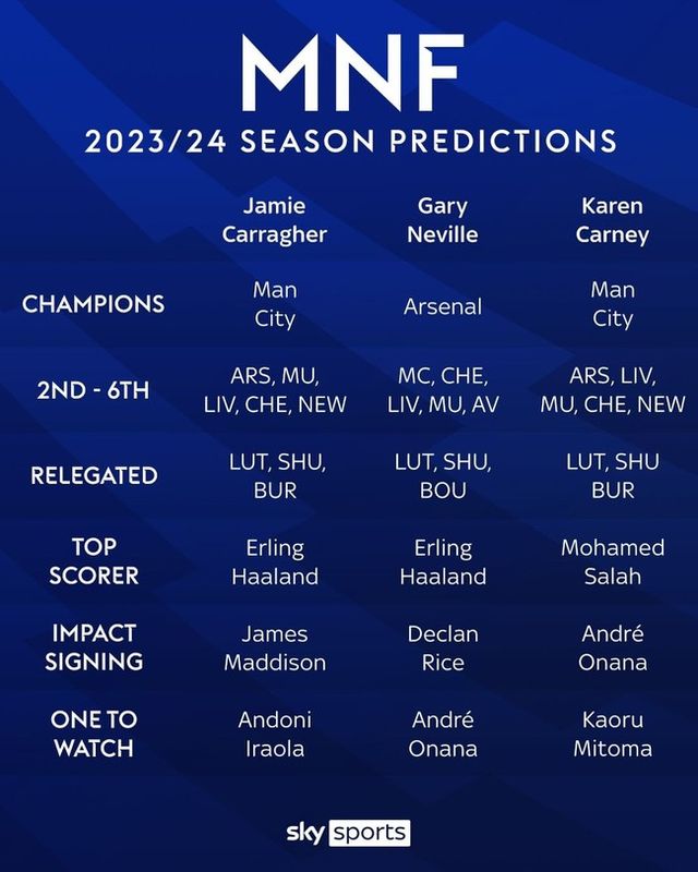 영국 ‘스카이 스포츠’는 2023-24시즌 EPL 순위들을 예상했다. 제이미 캐러거, 게리 네빌, 카렌 카니가 참여했다. 캐러거와 카니는 챔피언을 맨체스터 시티로 뽑았다. 네빌은 아스널을 택했다. 2위부터 6위까지를 보면 캐러거는 아스널, 맨체스터 유나이티드, 리버풀, 첼시, 뉴캐슬 유나이티드 순으로 선정했다. 네빌은 맨시티, 첼시, 리버풀, 맨유, 아스톤 빌라를 선택했다. 카니는 아스널, 리버풀, 맨유, 첼시, 뉴캐슬 유나이티드로 정했다.
