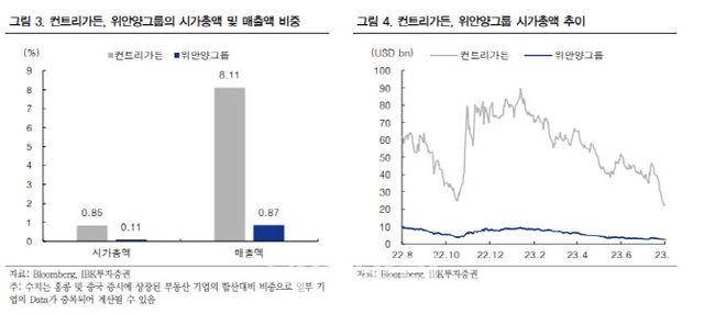 변 연구원은 “컨트리가든은 중국 부동산 시장에서 차지하는 매출 비중이 8.1%를 상회하는 대형 부동산 기업”이라며 “디폴트 및 파산가능성이 확대할 경우 파장 리스크가 클 것”이라고 예상했다. 컨트리가든은 2022년 매출 기준 83조원 규모로 부동산 개발업체 가운데 5위 권 안에 드는 최상위 업체다. 게다가 중국의 7월 신규주택 가격은 전월 대비 0.23% 하락하고 있다.