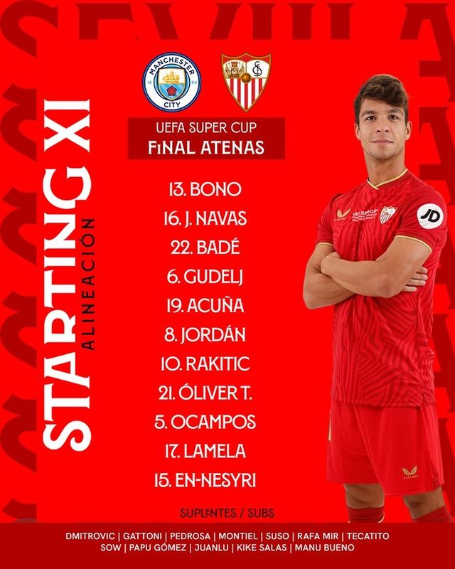 세비야도 4-2-3-1 포메이션을 내세웠다. 유세프 엔네시리가 원톱에 자리했고 에릭 라멜라, 올리베르 토레스, 루카스 오캄포스가 그 뒤를 받쳤다. 이반 라키티치, 호안 호르단이 3선에 위치했으며 마르코스 아쿠냐, 네마냐 구델, 로익 바데, 헤수스 나바스가 수비진으로 기용됐다. 야신 부누가 골문을 지켰다.
