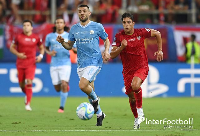 맨시티의 기회가 무산됐다. 전반 38분, 코너킥 상황에서 로드리의 헤더 슈팅이 라키티치 머리를 맞고 골문 위로 넘어갔다. 이후에도 맨시티가 주도권을 잡았으나, 세비야의 밀집수비를 뚫어내지 못했다. 결국, 득점이 나오지 않으면서 세비야의 1-0 리드 속에 종료됐다.