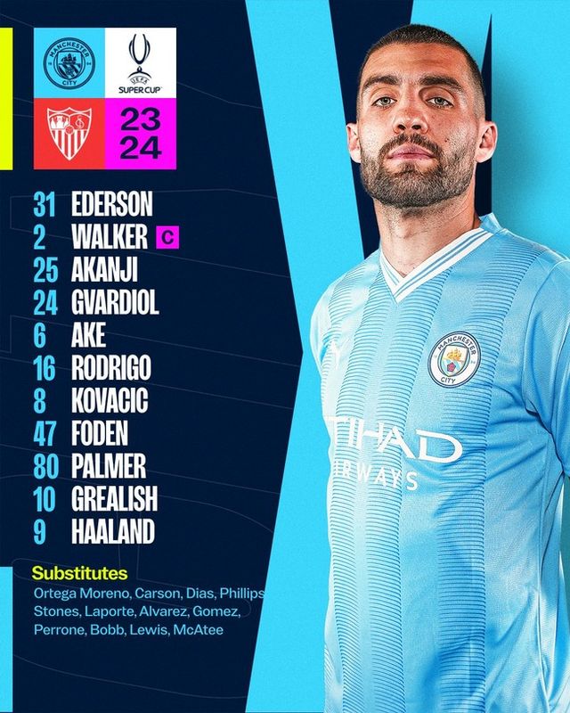 맨체스터 시티는 17일 오전 4시(한국시간) 그리스 피레아스에 위치한 요르요스 카라이스카키스 스타디움에서 열린 2023 유럽축구연맹(UEFA) 슈퍼컵에서 세비야와 1-1로 비겼다. 이후 승부차기에서 5-4로 승리하며 우승을 차지했다.