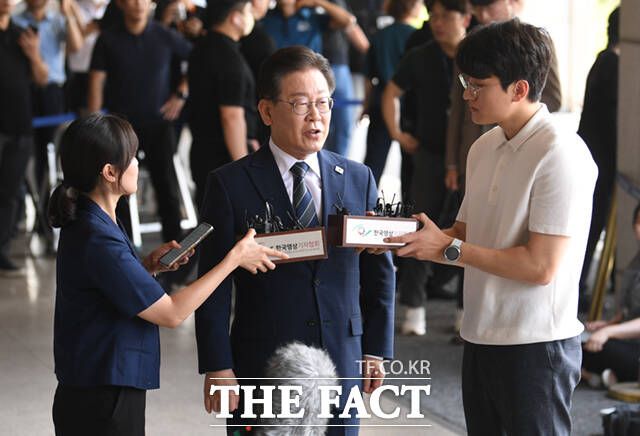 [더팩트ㅣ이새롬 기자] 백현동 특혜개발 의혹을 받는 이재명 더불어민주당 대표가 17일 오전 서울 서초구 서울중앙지검에 출석해 입장을 밝히고 있다.
