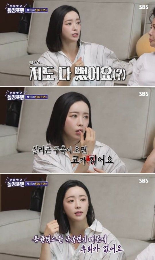산다라박은 코 수술을 하고 싶다고 언급했다. 이에 홍수아는 "요즘엔 내추럴한 코가 더 예쁘다. 저도 (코에서) 다 뺐다. 실리콘이 없다. 그냥 제 코다"라고 전했다.